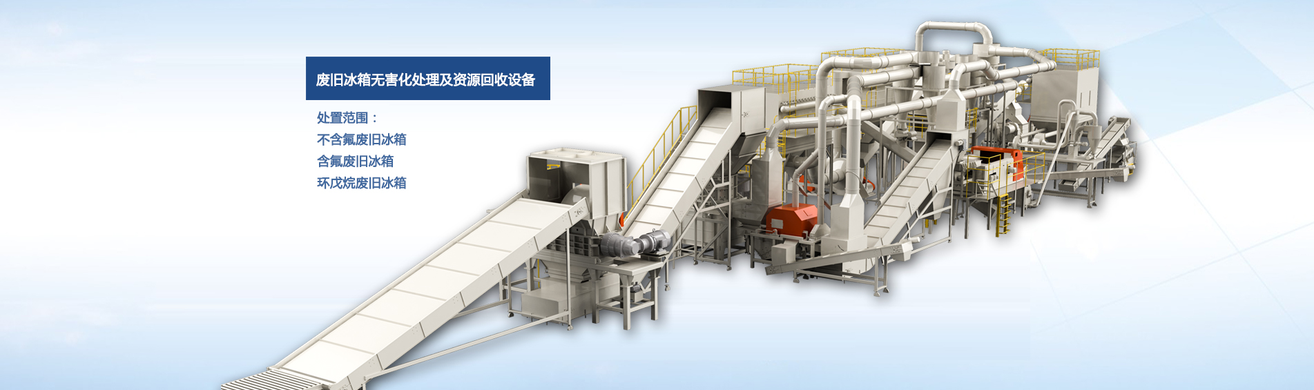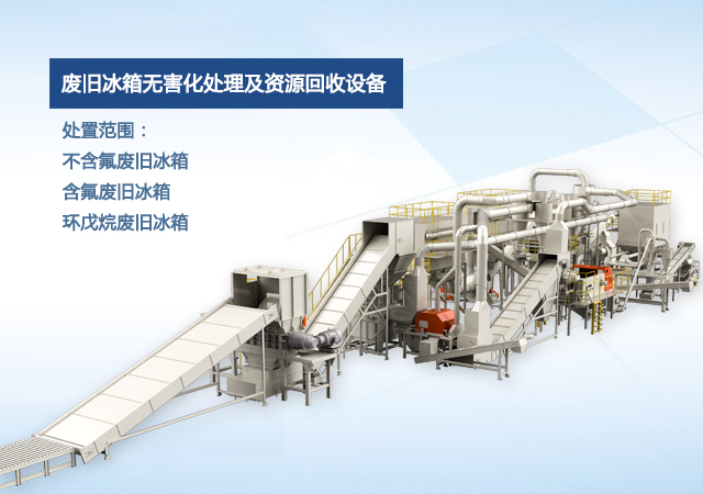 公司自主研發(fā)的廢舊冰箱無害化處理及資源回收技術(shù)及設(shè)備, 獨(dú)具 “雙軸撕碎機(jī)+立式破碎機(jī)+大風(fēng)量稀釋環(huán)戊烷氣體”的專利組合設(shè)計(jì), 主要用于對(duì)廢舊冰箱中的各種原材料進(jìn)行分離、 回收和利用, 具有自主知識(shí)產(chǎn)權(quán), 經(jīng)國家工業(yè)和信息化部科技成果鑒定為 “填補(bǔ)國內(nèi)空白, 達(dá)到國際先進(jìn)水平” 。